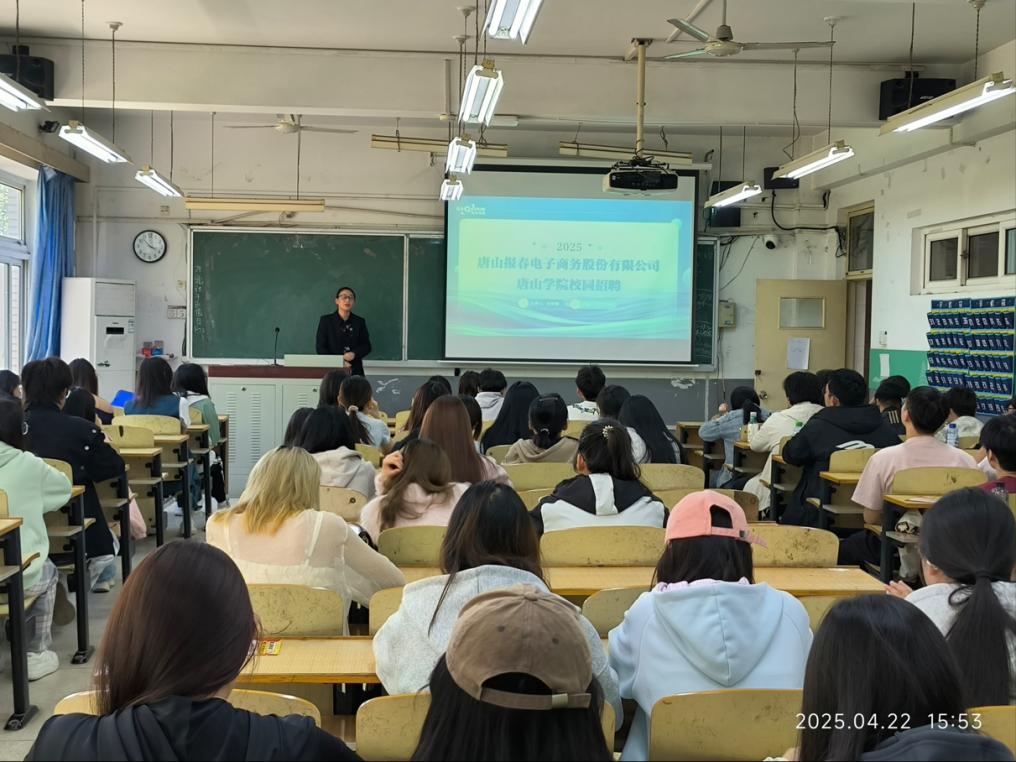 为落实党中央、国务院“稳就业”“保就业”决策部署,抢抓就业关键期,全力促进毕业生尽早就业,2025年4月22日,太阳成集团tyc33455ccwww与唐山报春电子商务股份有限公司联合,在2103教室举办了招聘宣讲会,太阳成集团tyc33455ccwww就业指导办公室主任周静芳老师出席本次宣讲会。现场气氛热烈,吸引了2021级100余名学生前来参加,有20余名学生达成就业意向。